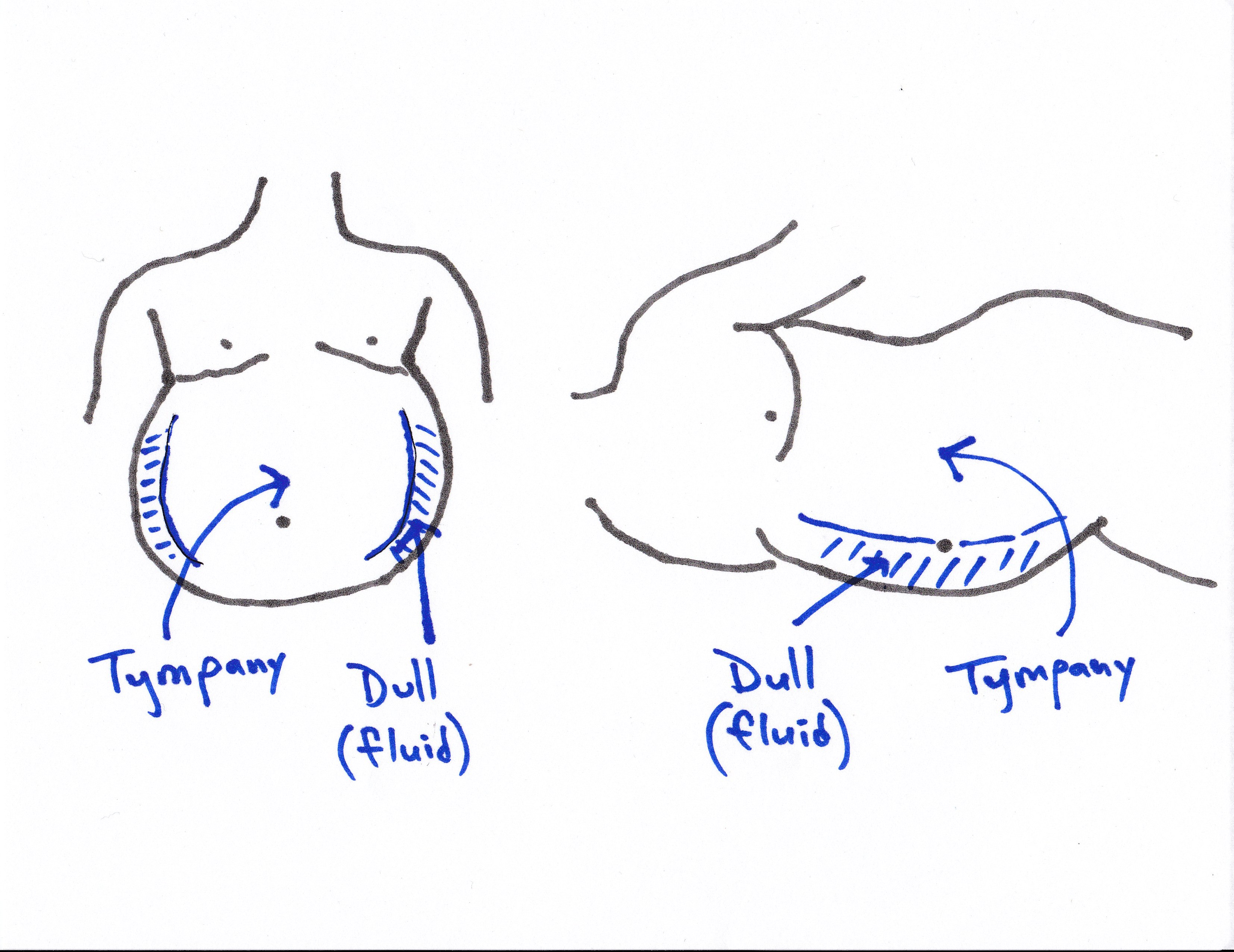 If umbilical area at “bottom” becomes dull, & flank at “top” resonant (or tympanic), fluid inside has shifted